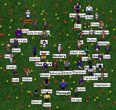 It was the work of but a few minutes for them to find him, surround him, and lead him laughing back to the meadow, where he was met by his fair bride and Healery, who was to officiate. After a brief pause for the guests and musicians to settle in the meadow, the bride and groom proceeded to the center of the field of flowers, followed by Healery. A sketch of the wedding party and guests is available.