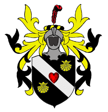 Sable, on a bend argent between two escallops or, a heart palewise gules. Mantling: Sable and or. Crest. On a wreath of the colours, a quill gules