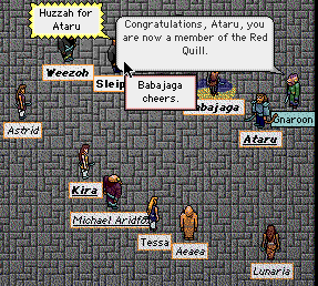 | An amazing clan meeting. More than two people showed up. Unbelievable. And Ataru joined. I can't say as how I know him really well, but I like what I've seen so far. Off to Noth to fall, and (of course) I have to dash off just as things get interesting. | ||||||||