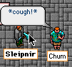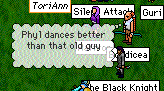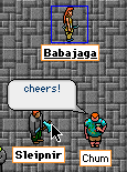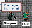 Well, at any rate, Sleipy went off a little annoyed and decided to get a spot of revenge. VERY unknightly. Oh dear oh dear, naughty fellow. Stole Chum's martinis from the Purple Tor Inn, and doctored them with herbs to make Chum turn purple when he drinks them. Got Baba to flash her legs (and other bits and pieces) at Gumdar to keep him occupied. Thanks to Polgara and ToriAnn for timely flashes as well. Tut tut. I actually remembered to make a movie of the theft. It's a bit long and boring in places. So don't complain, you've been warned.