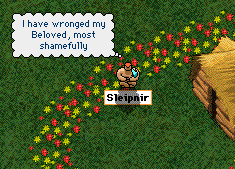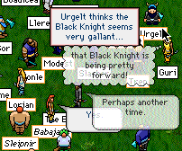 Of course, Sleipy was on the jury. Irony supreme. Verdict - guilty. Babajaga was fined 1 coin, and did jail time. Ouch. Poor thing, to suffer so for true Love. Did that convince Sleipy to rejoin RQ and the Knights? Hell no. What's the point of self-pity and pathetic drama if you don't stick to your guns? I mean to say! So thats how it stands now. Sleipy's out of RQ and the Knights (but he'll rejoin soon I have no doubt), standing on his silly pride rather. |
