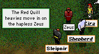 As for Zeus, well, he's not so bad you know. For a kid. Better than Kira, anyway. But sometimes I just can't resist winding him up a little. Naughty me. But, hey, I've got to get my giggles one way or another. Then I tried to wind up Althea, but SWC must have been tired or something, 'cause she just ignored the Knight. *sigh*. Klur (as usual) was as interesting as a lump of butter. Kick a pig, you'd get a better response. But nobody can say I didn't try. Almost as much fun as PvP.