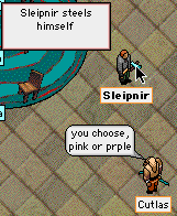 | The pink hair was also required by the PM admissions committee. Ack. Well, at least Cutlas gave Sleipy a choice. Clearly coolness hath its price.