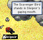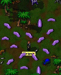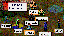Sleipy is trapped. This is what happens when you go hunting with Rylantar, one of Sleipy's squires, and a most dedicated one too I must say. Very dedicated, and will be an excellent Knight I'm sure. Sleipy was saved by ... er... Freyja and Topaz who both promptly got upset with him, firstly, for forgetting to share, and secondly, for yelling out about Baba while another lady was saving him. Well, bloody hell. Don't they know *anything* about Sleipy? I guess not. Probably never heard of him or of Babajaga or of the Red Quill or anything. After all, why should they have? Well, at least the Red Quill is better than that other pathetic clan, the Piece of Sh...er.... I mean POS. Ahem. Txara Serene gave Sleipy a special longsword. It has a history and all. One of three made especially to kill nasties. The other two are lost. He now uses it religiously instead of his axe. He still keeps Manx on a permanent share lock because I still so love that picture she drew of him. Damn, Manx is highly talented. I mean, really. She really is. But Sleipy has had to give up using his axe, and switch to the longsword instead because it was, after all, a special present. Sleipy is still miles and miles from passing the fourth circle test. Miles. Do I care? Hell no. Don't give a fuck. Trouble ahead.... trouble behind... come on Sleipy better... watch your speed. That Knight has trouble in store for him. OK, OK, so this is an old picture. Sue me. As I remember he got so mauled by Cutlas, Althea, Luce and Slyph acting in concert that he ran with his tail between his legs. Yes, all you panting ladies, his tail. That's all. Don't get excited now. This morning I heard on the radio.... "Staaaand by your maaaaaan.." I burst out laughing. "Staaaaaaand by your claaaaaaan..." being Vagile's version. Cracks me up. Well, Vagile cracks me up in general. Possibly the funniest exile of them all. Well, closely followed by Slyphers. That's pink fluffy Slyphers. |